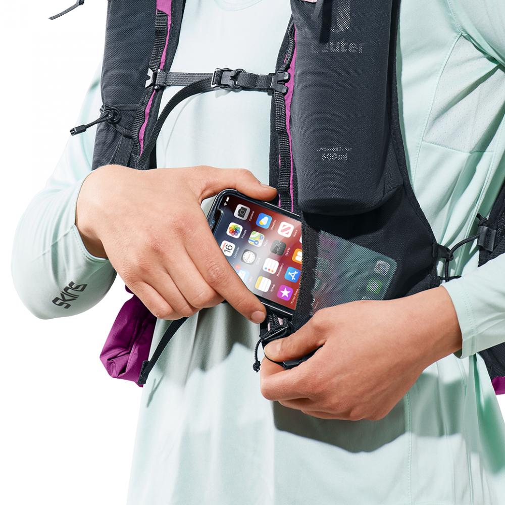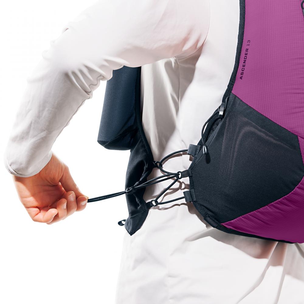 | Befestigungsmöglichkeiten | Stockhalter am Schulterträger, Taschen für Softflasks, Tasche für Wertsachen/Reißverschlussfach am Träger |