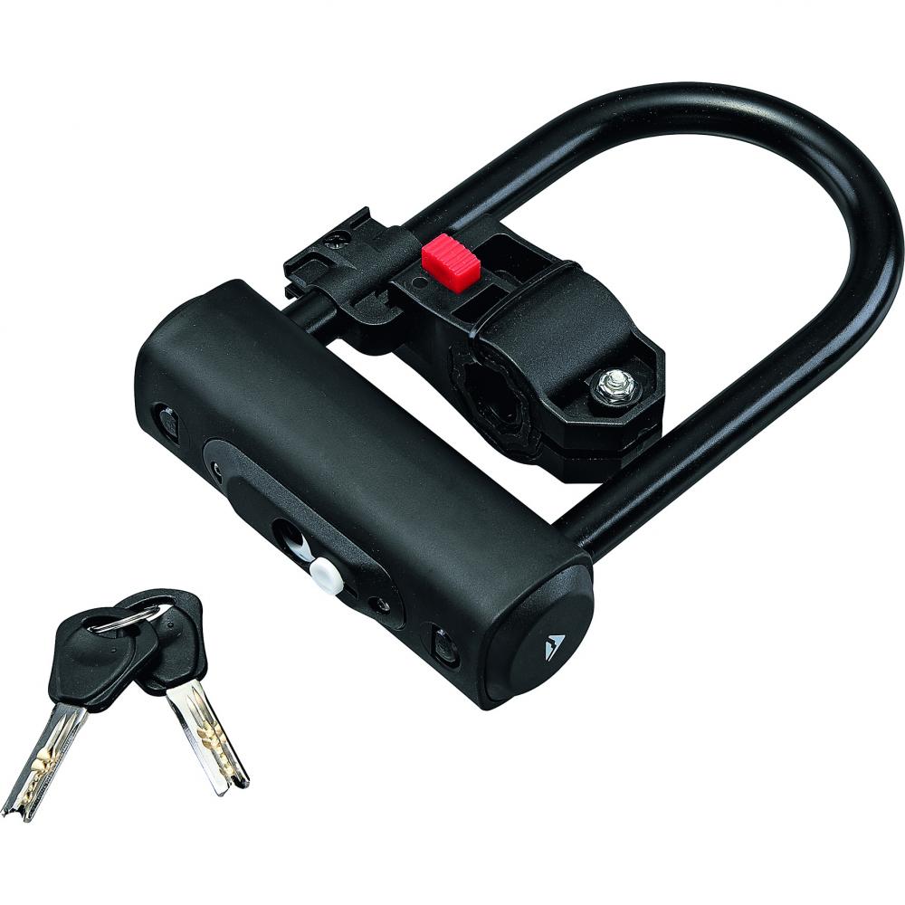 Stabiles Bügelschloss mit Rahmenhalter, Staubschutz und zwei Schlüsseln. Geeignet für die gängisten Rohrdurchmesser dank Ausgleichshülsen.
