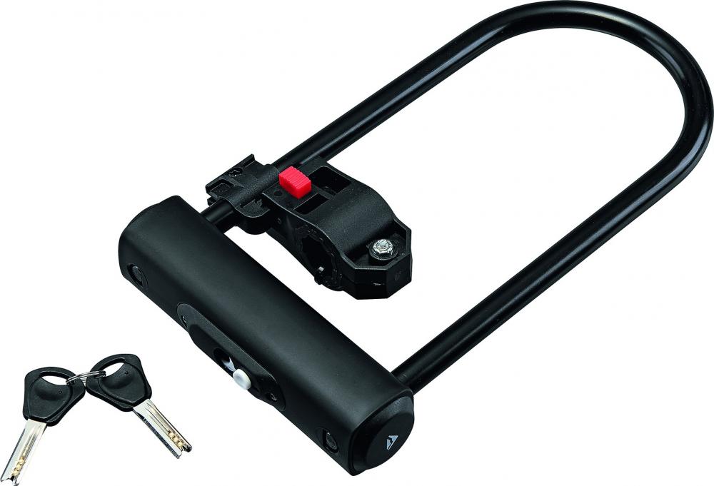 Stabiles Bügelschloss mit Rahmenhalter, Staubschutz und zwei Schlüsseln. Geeignet für die gängisten Rohrdurchmesser dank Ausgleichshülsen.
