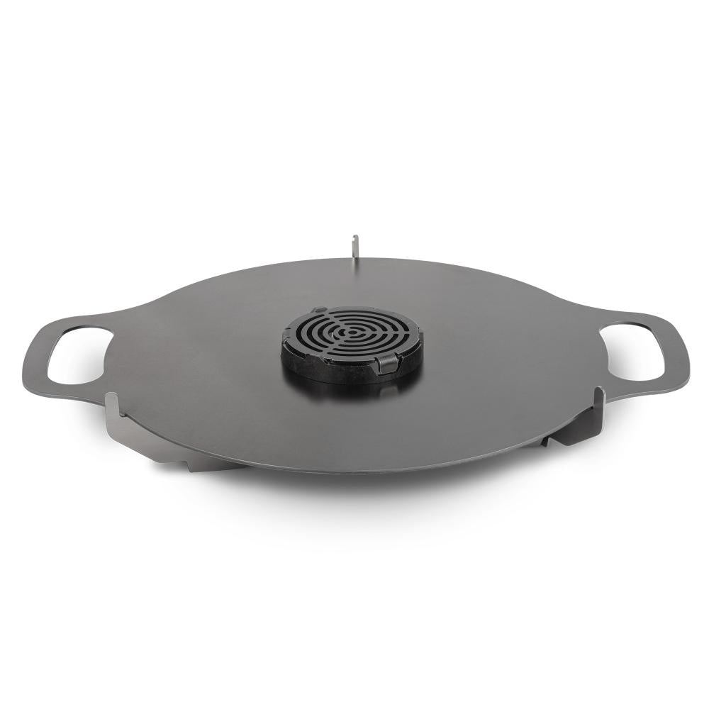 Die Petromax Grillplatte ist die ideale Ergänzung für Ihren Atago Campinggrill und verwandelt ihn in eine vielseitige Plancha-Grillstation. Gefertigt aus 3 mm starkem, geöltem Stahl, ermöglicht sie das gleichzeitige Zubereiten verschiedener Speisen bei unterschiedlichen Temperaturen. In der Mitte der Platte herrschen hohe Temperaturen für das scharfe Anbraten von Fleisch, während der äußere Bereich sanftere Hitze für das Garen von Gemüse oder Meeresfrüchten bietet. Die zentrale Aussparung erlaubt das einfache Nachlegen von Brennmaterial, ohne die Grillplatte abnehmen zu müssen. Durch das Einbrennen vor dem ersten Gebrauch bildet sich eine natürliche Patina, die einen Antihafteffekt erzeugt und den Geschmack Ihrer Speisen verfeinert. Das mitgelieferte dreiteilige Steckgestell sorgt für eine stabile und passgenaue Auflage auf dem Atago. Dank der seitlichen Griffe und des zerlegbaren Gestells ist die Grillplatte leicht zu transportieren und platzsparend zu verstauen – perfekt für Outdoor-Abenteuer.