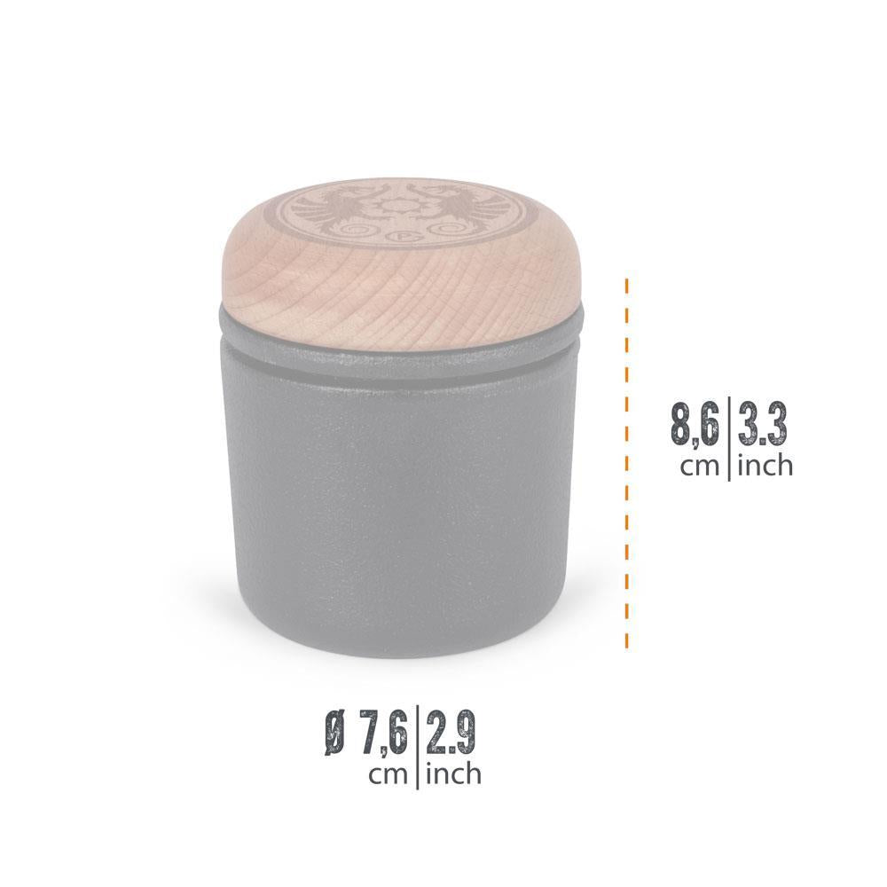 Edles Design: Der Holzdeckel mit eingraviertem Petromax-Drachenlogo verleiht dem Mörser ein ansprechendes und traditionelles Aussehen.