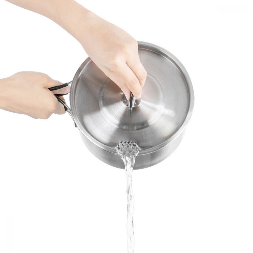 Edelstahl-Kochtopf mit Sieb-Funktion im Deckel. Die zweckmäßige Lösung zum Abgießen des Kochwassers. Fassungsvermögen: 1,6 Liter.